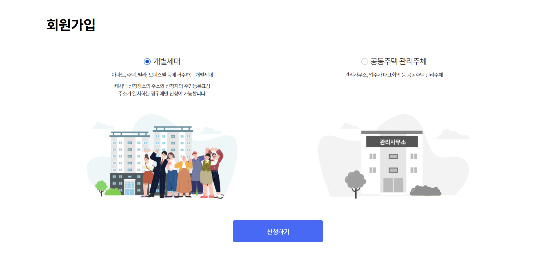 신청 주소지와 주민등록 주소지가 일치하는 사용자(주민등록표상 구성원 중 1인)가 신청할 수 있습니다.